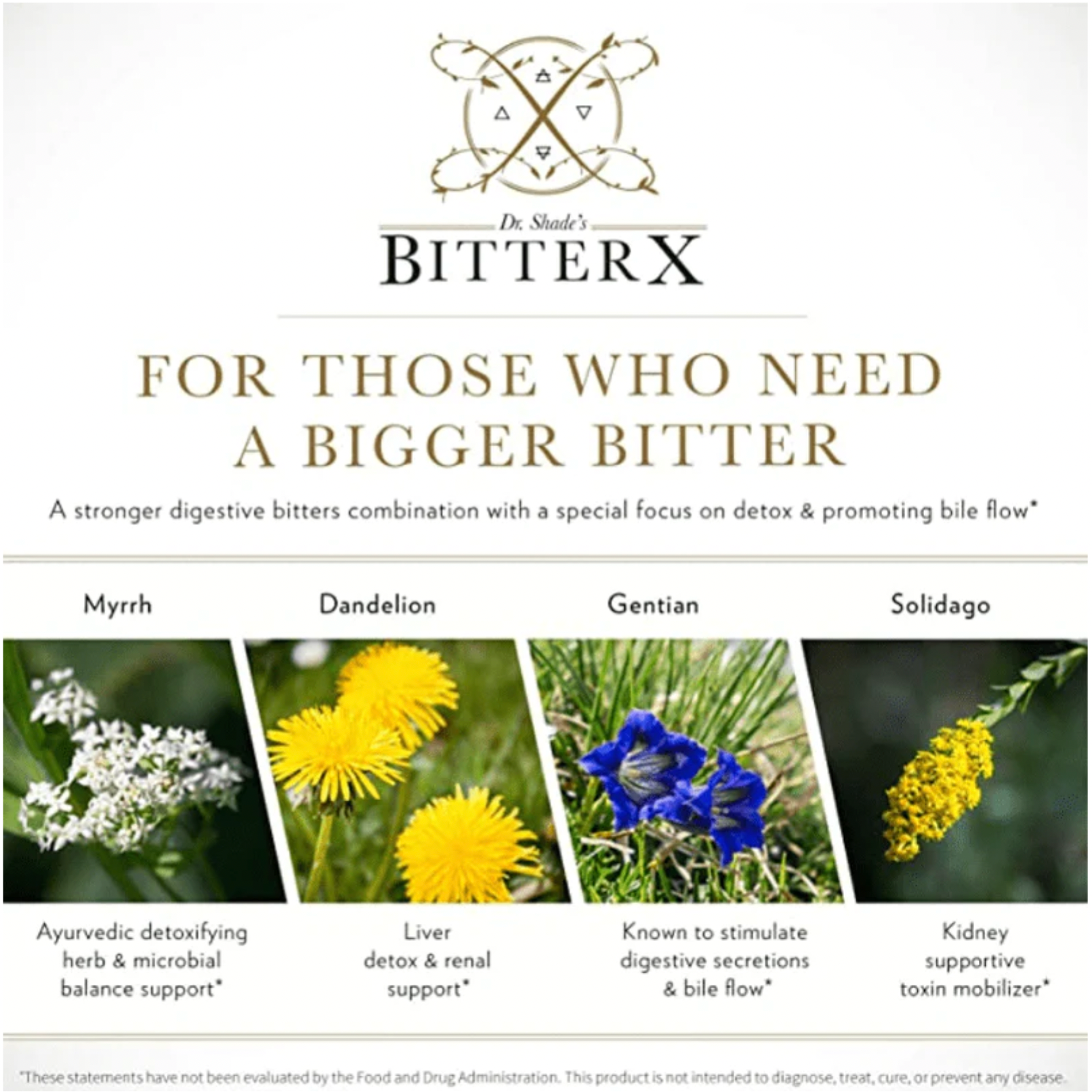 BitterX is a whole body bitter tonic and potent blend of four herbs, which builds on the immensely popular Quicksilver Scientific product, Dr. Shade's Bitters No. 9. This new medley contains four digestive, liver, gallbladder, and kidney supportive botanicals. BitterX is a stronger bitter combination.*