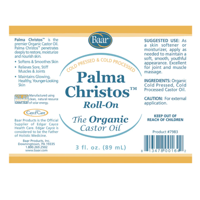 Baar Products' organic Castor Oil is trademarked as Palma Christos. It is organic, cold-pressed, and cold-processed Castor Oil. Palma Christos™ has all of the benefits of our Palma Christi Castor Oil with the bonus of being organic.
