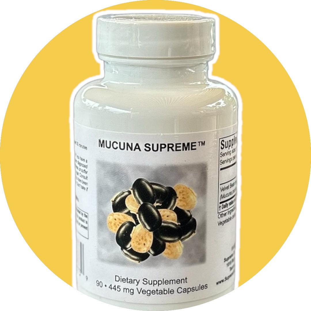 Mucuna Supreme™ is packaged in a bottle of 90 veggie caps, each containing approximately 509 mg of Mucuna pruriens without fillers, binders or excipients. One capsule on awakening, at least 30 minutes before food. Two Capsules may be needed but ask your physician before increasing.
