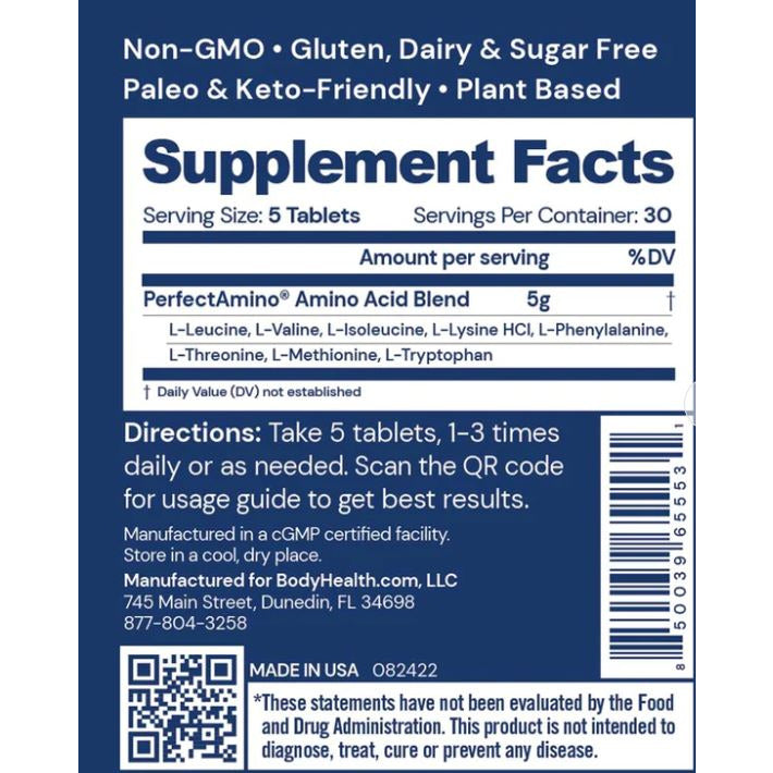 PerfectAmino® contains the eight essential amino acids the body needs to support and maintain its muscular, skeletal, enzymatic, and hormonal systems. The essential amino acids in PerfectAmino are in the exact proportions needed for maximum utilization by the body.
