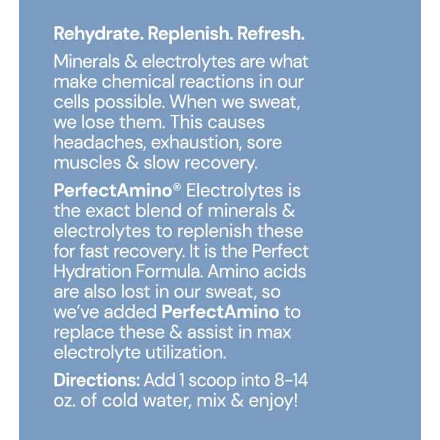 PerfectAmino Electrolytes is the first electrolyte supplement to incorporate the building blocks of protein, amino acids, in perfect ratios to kick-start the protein building and repair process in the body. For the first time, you are not only replacing lost salt, potassium, and minerals but also the building blocks of protein: essential amino acids!